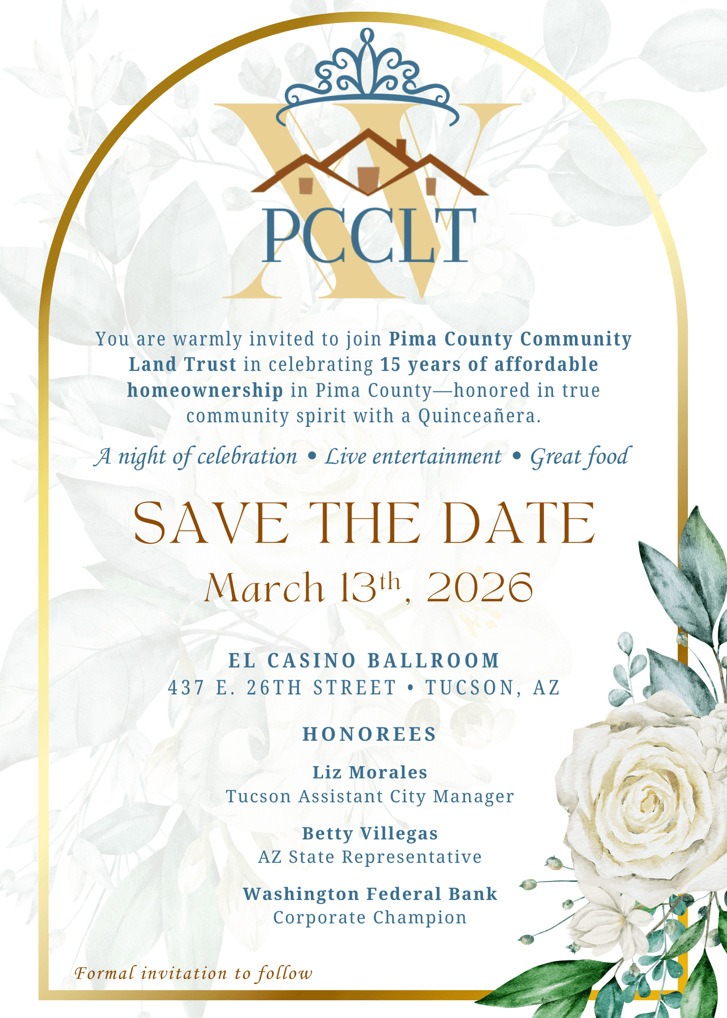 Pima County Community Land Trust invites you to a special QuinceaƱera-style celebration honoring 15 years of affordable homeownership in Pima County. Join us for an elegant evening of celebration, live entertainment, and great food on March 13, 2026, at the El Casino Ballroom in Tucson.